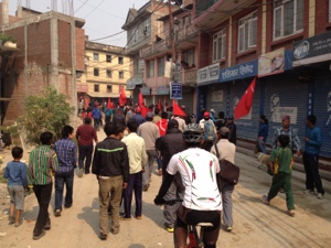 Today was a huge city wide strike against the government. People in favor of the Maoist insurgency is against the Prime Minister. No cars, trucks or buses, and most businesses stayed closed for fear that pro Maoist folks will come and damage their business. The point is to make the PM think about the people instead of himself, as it was explained to us. The clear advantage for us was that no matter where we went, there were literally no cars on the road. There was an exemption on the strike for tourist vehicles. Normally, most of the roads are nearly choked to a standstill with cars going every direction and honking horns ceaselessly. We did see many groups of chanting people with red flags with the Communist hammer and sickle symbol throughout the city, along with a very major police presence as well.