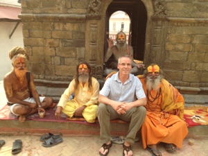 Next was Pashupatinah Temple; this was a most fascinating place because as is the custom with Hindus, the bodies of the dead are burned in traditional funeral pyres and then all of the ashes are pushed into the river, on the belief that the ashes will eventually flow to the sea. So while we were there, we saw two pyres being built which is logs stacked square to each other, and then a body wrapped in decorative robes placed on top, and the whole thing lit on fire. It was a fascinating thing to watch, in essentially a public setting, something us Westerners would never do because we seem to manage our dead and death with so much more privacy and tidiness..