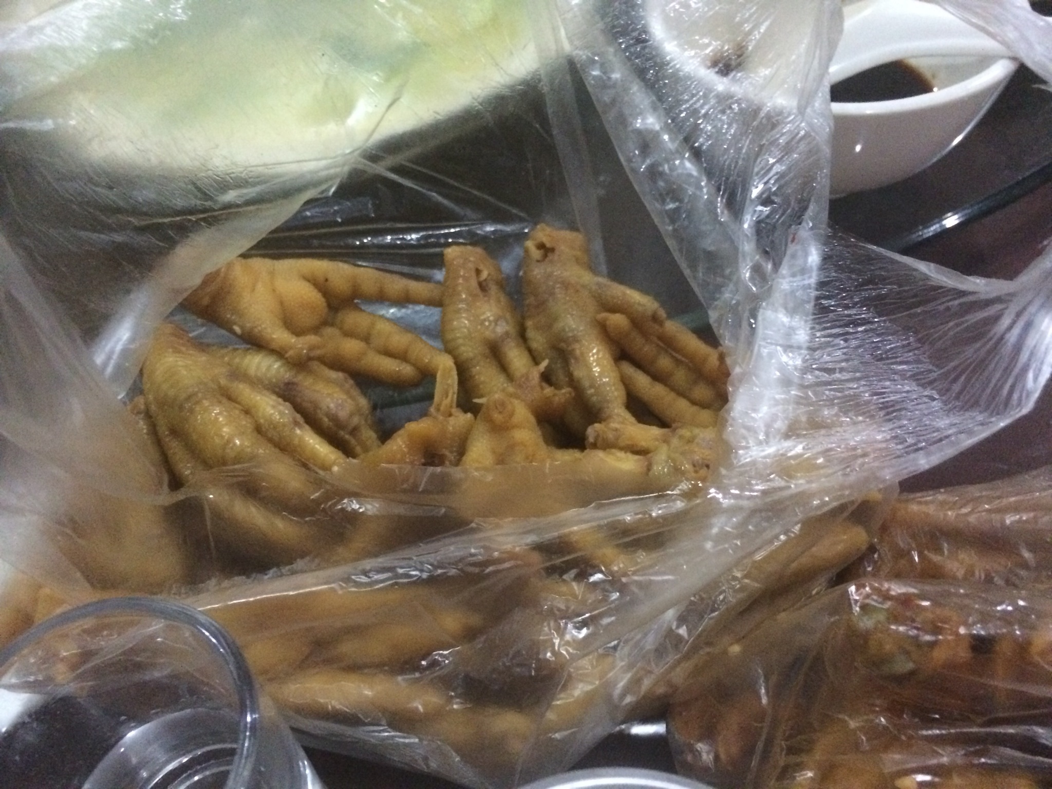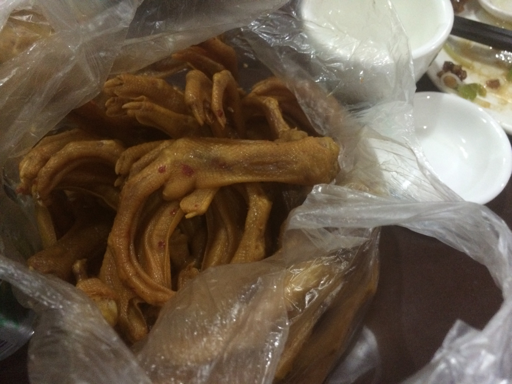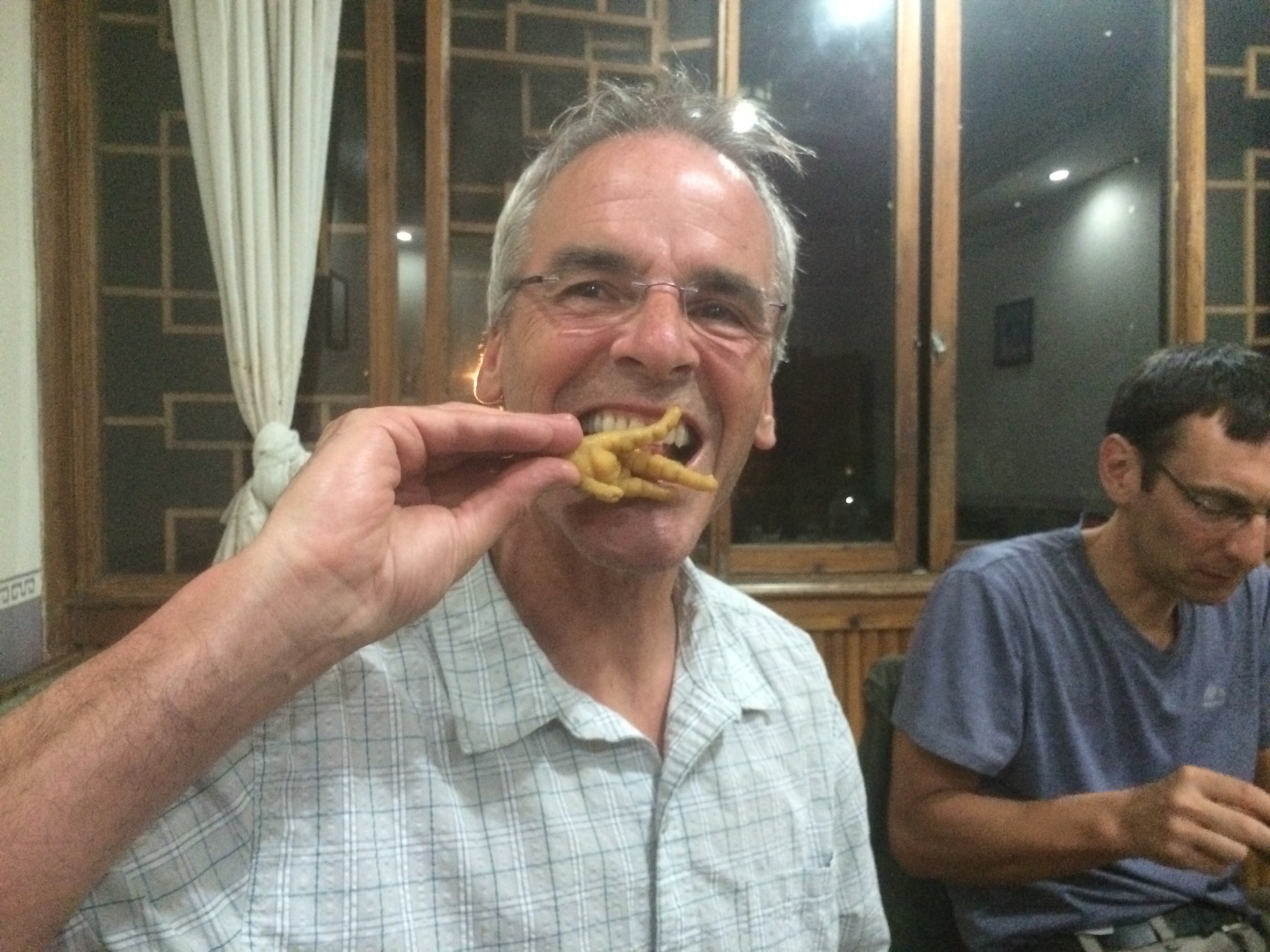 Forgot to mention that last night after the main dinner, and the rice wine was flowing, in fact five kinds of it, two of which tasted like nail polish remover, the duck feet and chickens feet came out. I had a few of each, they’re kind of an interesting item, and the methodp of eating is unusual but makes total sense. There will be a picture of me gnawing on one below… and regarding the rice wine, as is common for people make their own rice wine, add herbs, fruit, or flavorings or insects or snakes to it. Last night we also had a rice wine with hibiscus flowers added that was very pleasant.