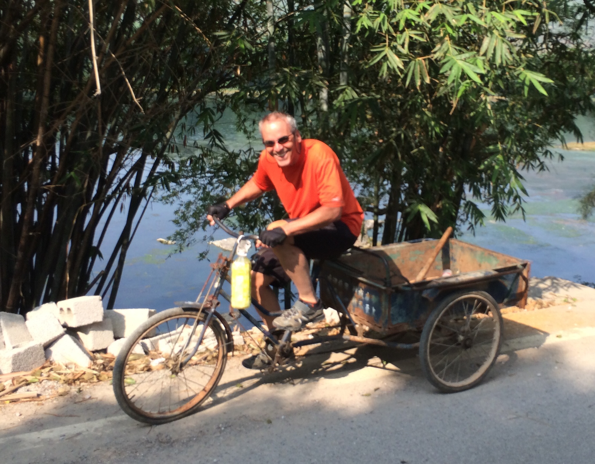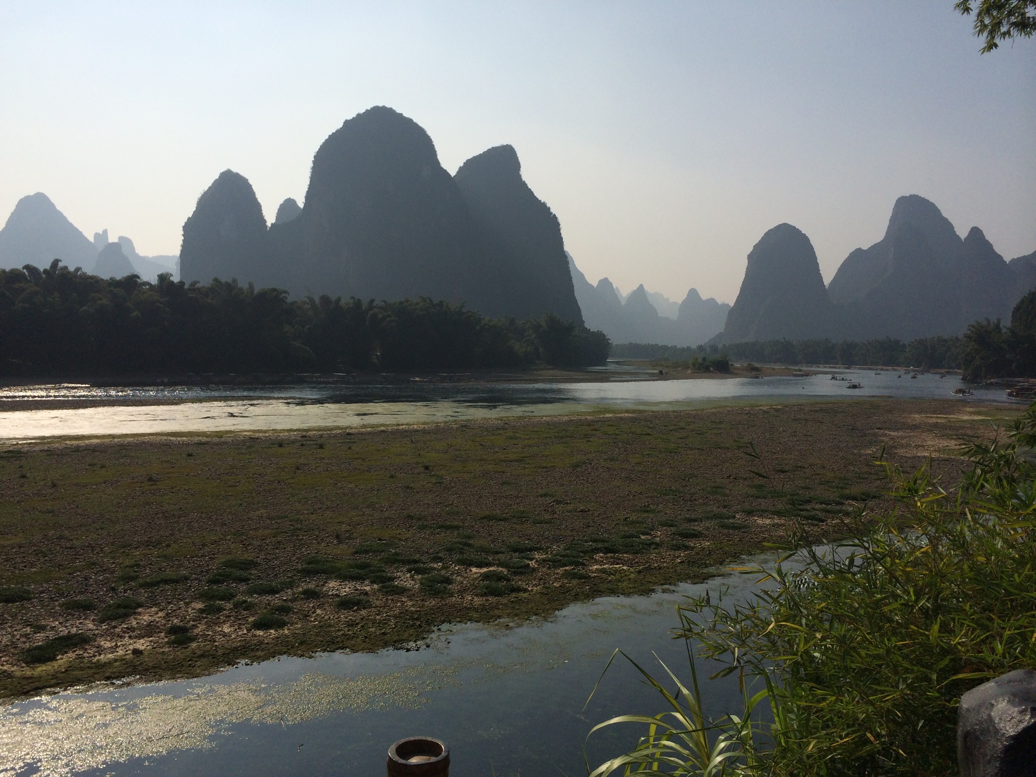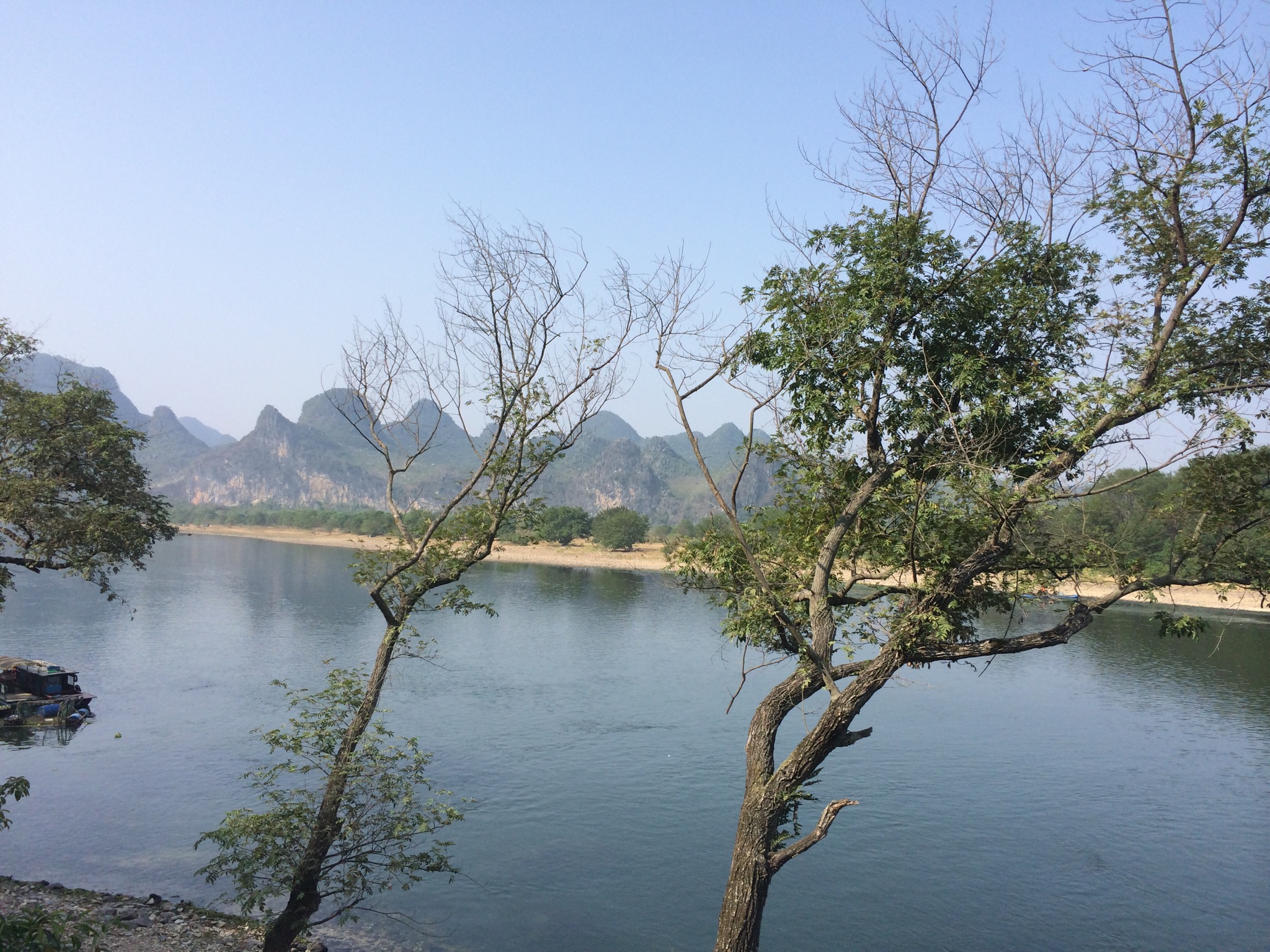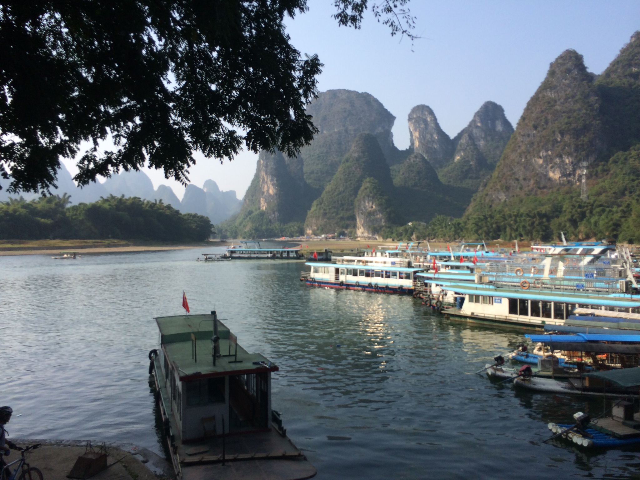 Today’s ride was epic! The sun was out, it was hot, there were some fantastic hills without any traffic, we were in the midst of limestone karst country, the Li River for was visible from many vantage points, the surface on much of today’s road was absolutely smooth, I don’t think you could’ve had a better cycling day! Well, except that I broke my chain for the third time. I’ve never broken a chain in my entire cycling career, so to break one three times on this bike is unusual. I will talk about the day in chronological order of course, but finishing with the evening discussion at the table for dinner, Chu told me that they have had the same problem with this bike before, breaking a chain on the prior trip. Tells me that I was using a repaired chain. When you push the pins out of the links, they’re never quite the same and that’s what I attribute my break issues, not my riding style. They finally put on the new chain today, no problems since! In fact, somehow today I got 40 minutes ahead of the group, they all said they wanted my old chain back on the bike to slow me down! Funny, but made me a little proud of myself too…! On arrival here, I got to sit under a shady banyan tree for half an hour sipping a very cold Coca-Cola waiting for the other folks to arrive…