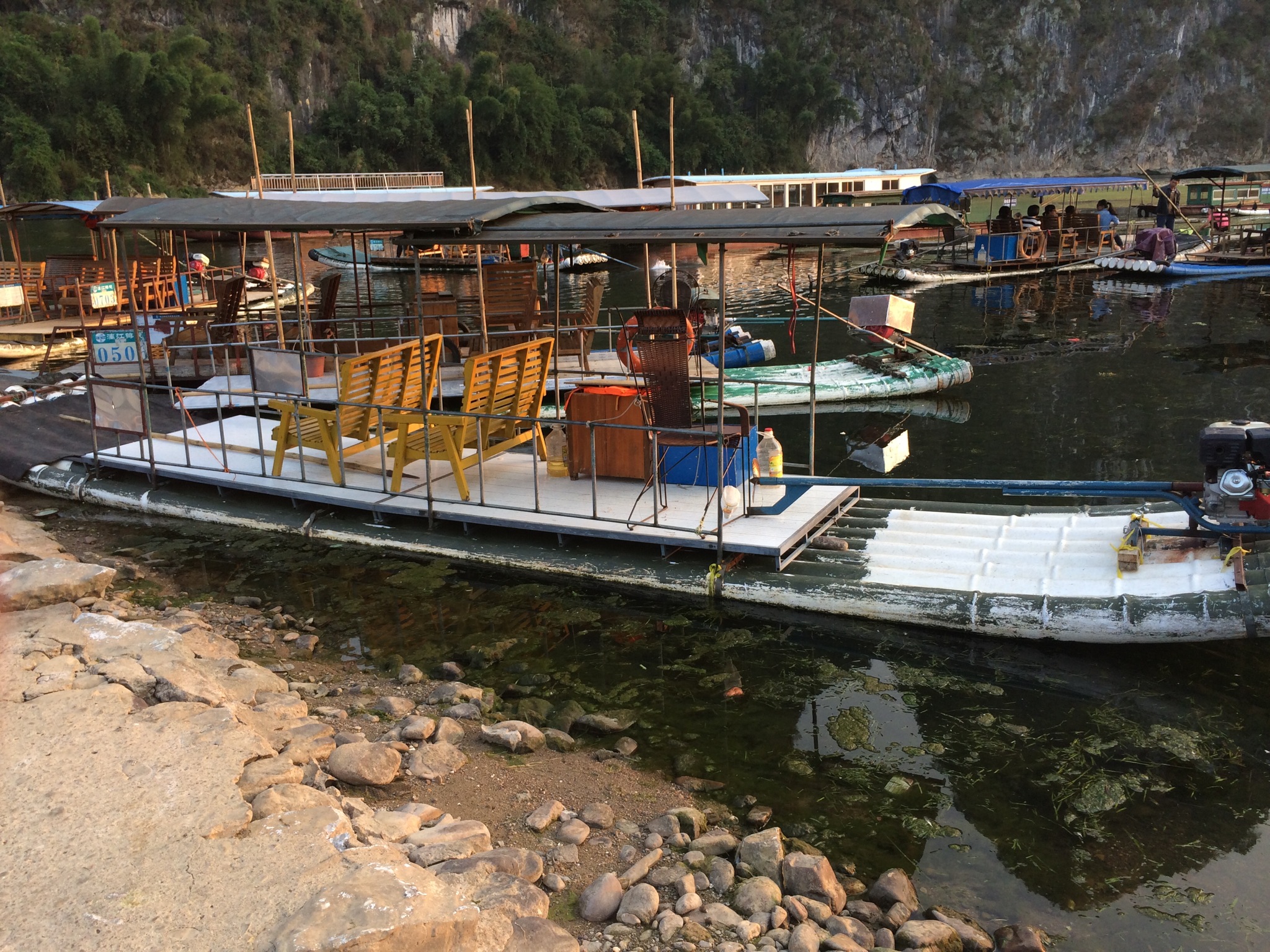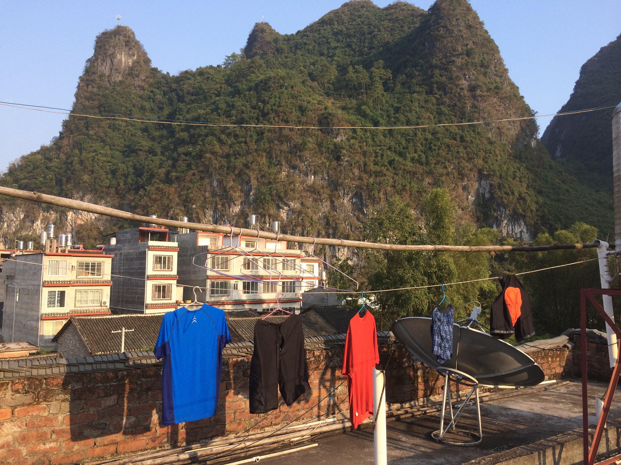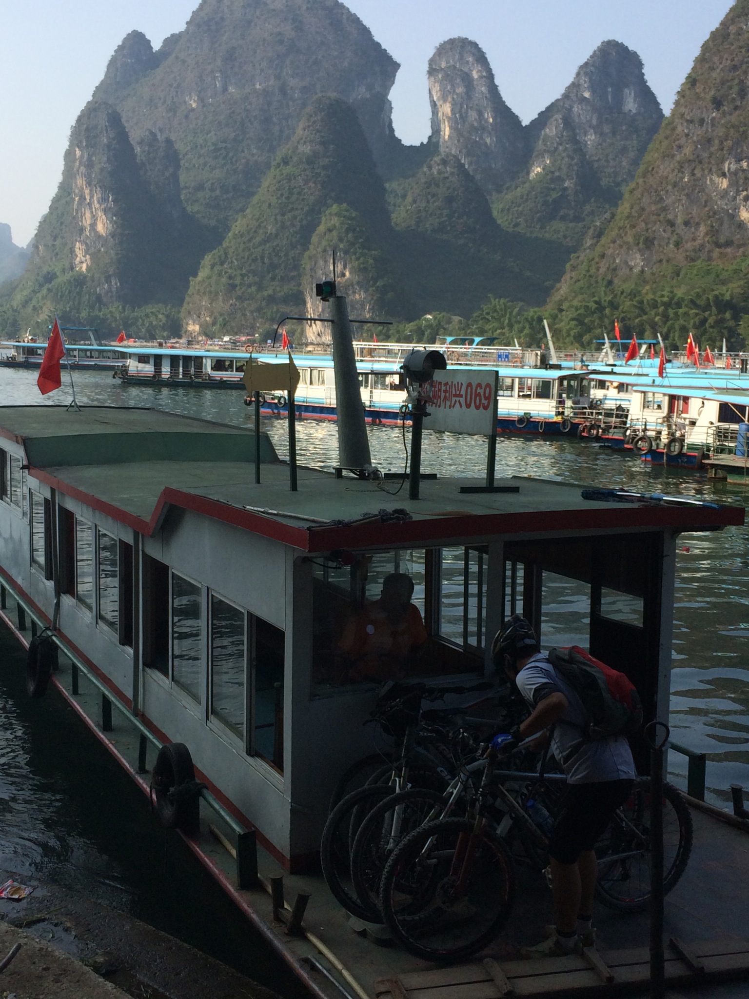 After our fantastic cycling day up and down through the karst mountains, we arrived in Xing Ping (shin ping) for a late lunch. The food was great, and after lunch we had to take a boat across the Li river to the other side where our nice but modest hotel was. We loaded all the bikes, our luggage, ourselves, among 50 locals across the river. I have a great video of it… But I cannot post a video to the blog. Got to the hotel, since it was the end of the riding day I had a cold beer, grabbed a shower, did laundry, hung all the laundry up on the roof in the hot sun to dry.