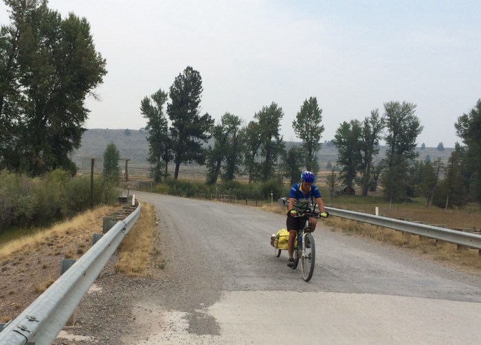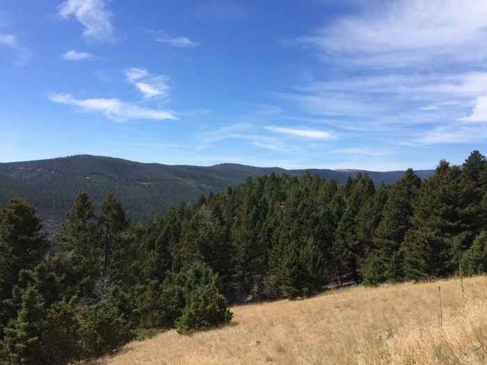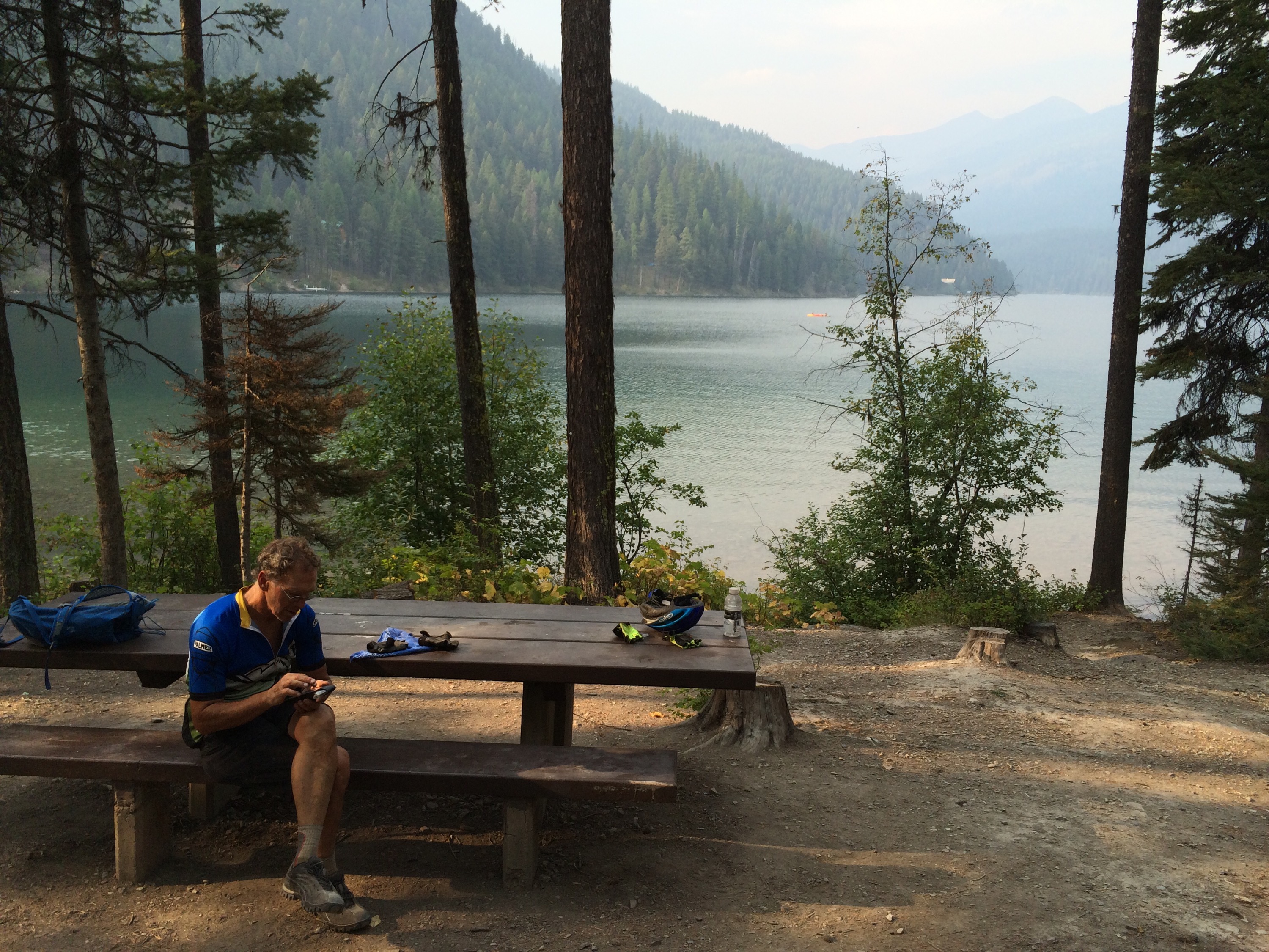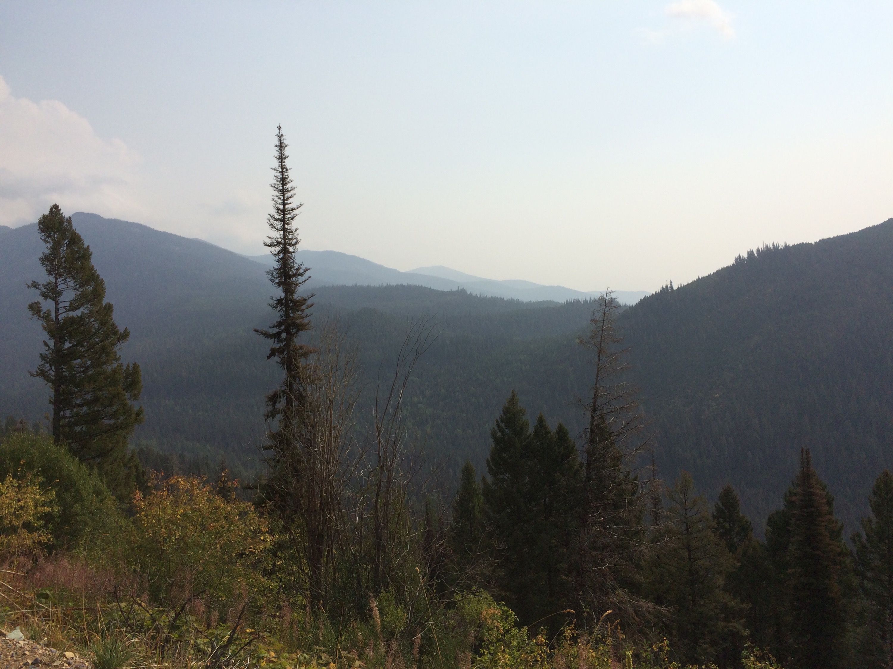 We busted ass up Huckleberry 5500′ pass first thing, but a reasonable grade, then a long descent back to the valley floor into Lincoln. For lunch I had two beers and a chicken sandwich!! The smoke was back…
