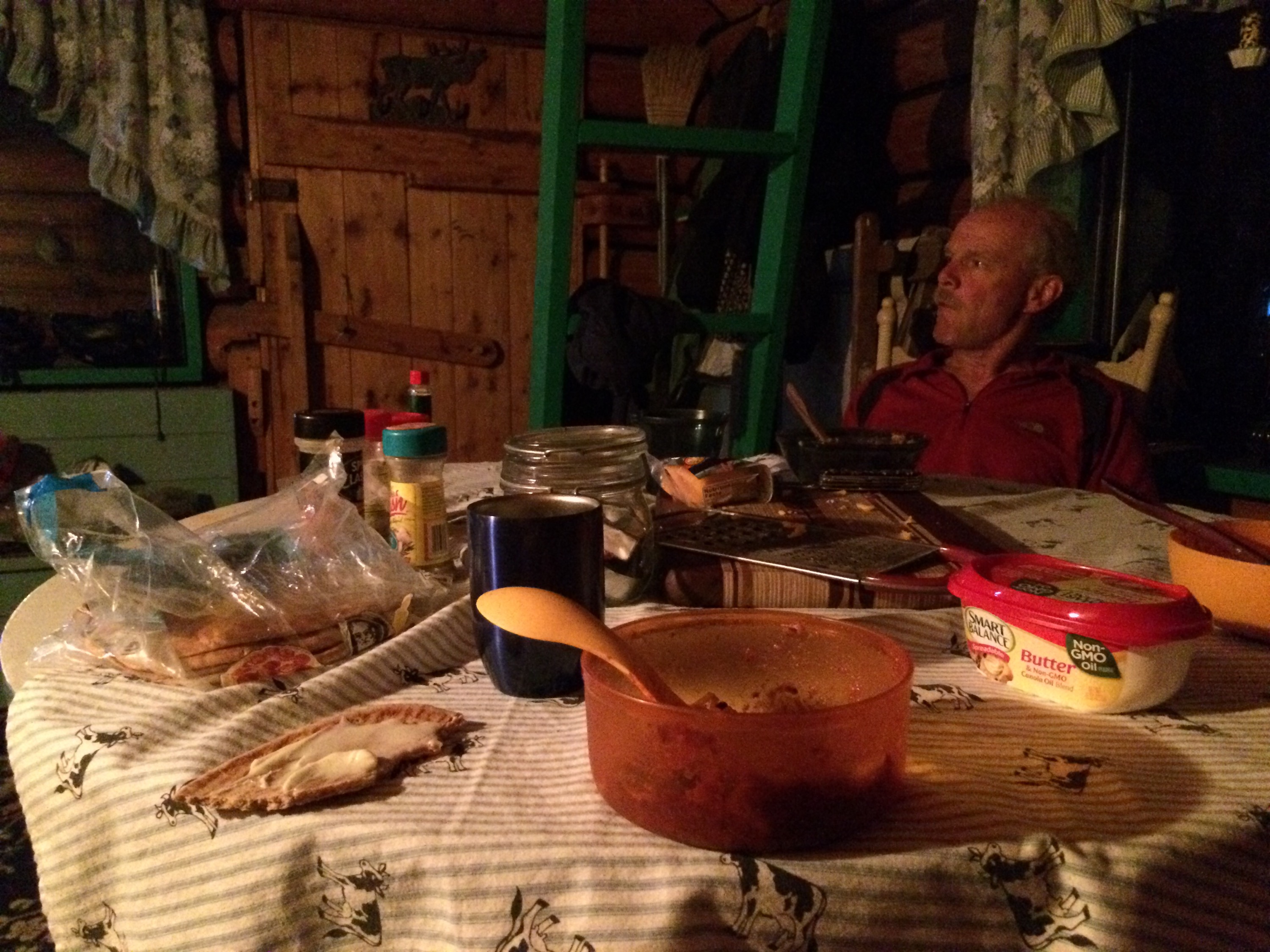 I was the night’s cook, giving Dave a break, cooked chili from a bag with fresh garlic over boiled pasta. Wow, and not just saying cuz I cooked it, but perhaps the best meal we’ve enjoyed while in this magical cabin hearing the brutal wind just outside… A trip remembrance moment after a long cold hard day…