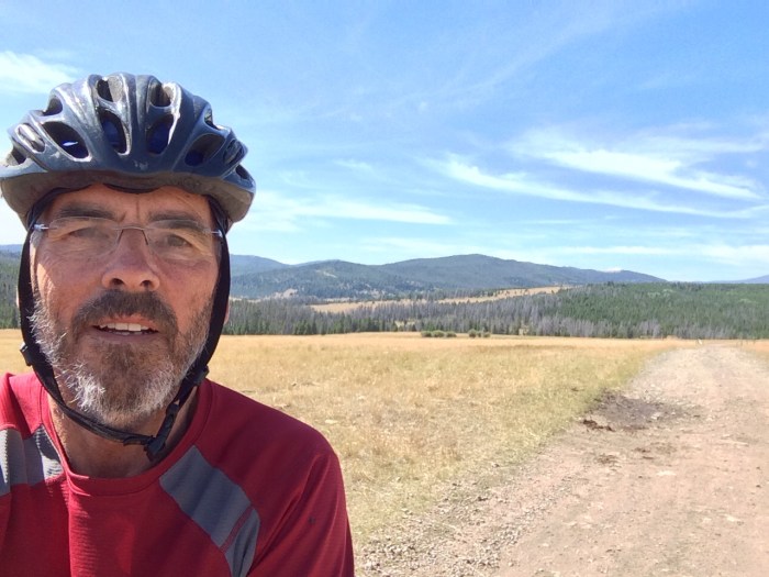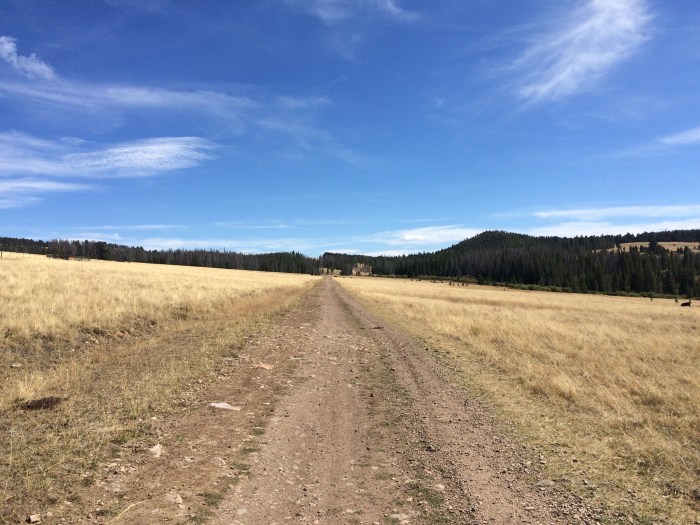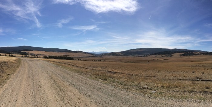 Got well ahead of Dave and Chris out of Orvando, riding on dusty flat washboardy straight line roads through cattle fields of total dry brown. Eventually will get back into the trees as we head toward Huckleberry Pass, about 1600′ higher than our current elevation.
