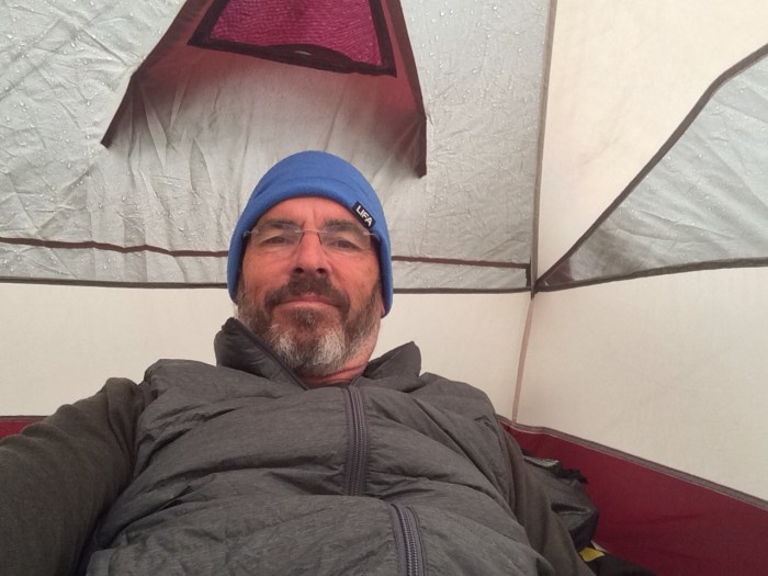 I have EVERYTHING in the tent except my bike and large dry bag. Mr Kessler and Mr Boston are in the tent as well, warming me from within. It’s 5:12pm. I’ll wait to see if this lightens at all, would love to cook dinner somehow!