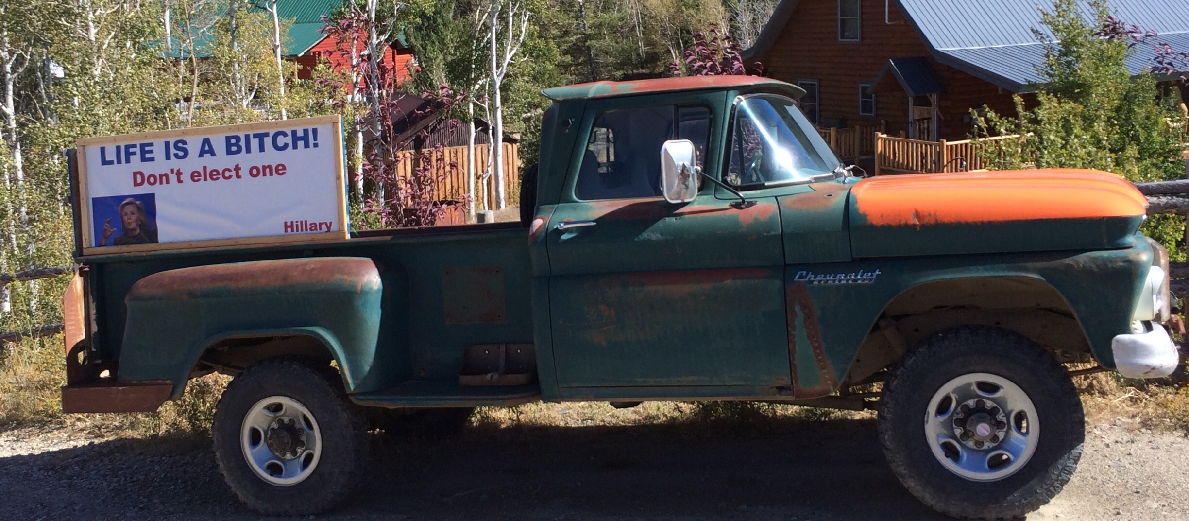 Talking with the proprietor, I asked about lodging and he said he has a friend named Mark who has a place. I suspected it was the same place as the guy that you parked your truck with a large sign on it that said “Life is a bitch, don’t elect one” which was anti-Hillary Clinton sign.