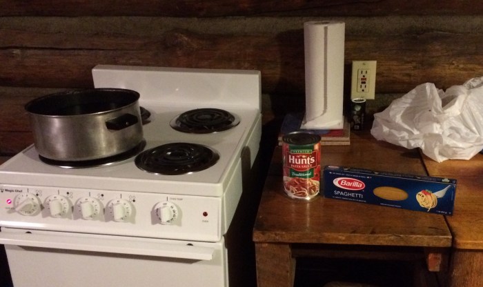 While I’m there in the store, I notice VERY few food items, but there is a box of spaghetti and a can of Hunts Pasta Sauce! (Also chicken Rice a Roni. Yum!) Would I buy this in real life, probably not. But in this paradigm of cycling all day, day after day, hellya I’m having spaghetti tonight! The cabin has a stove, water, pots/pans!!!
