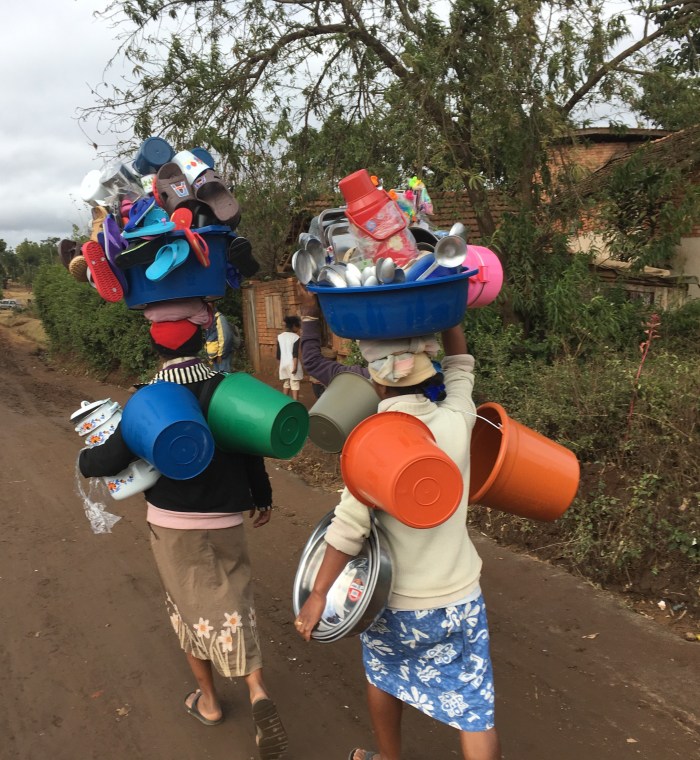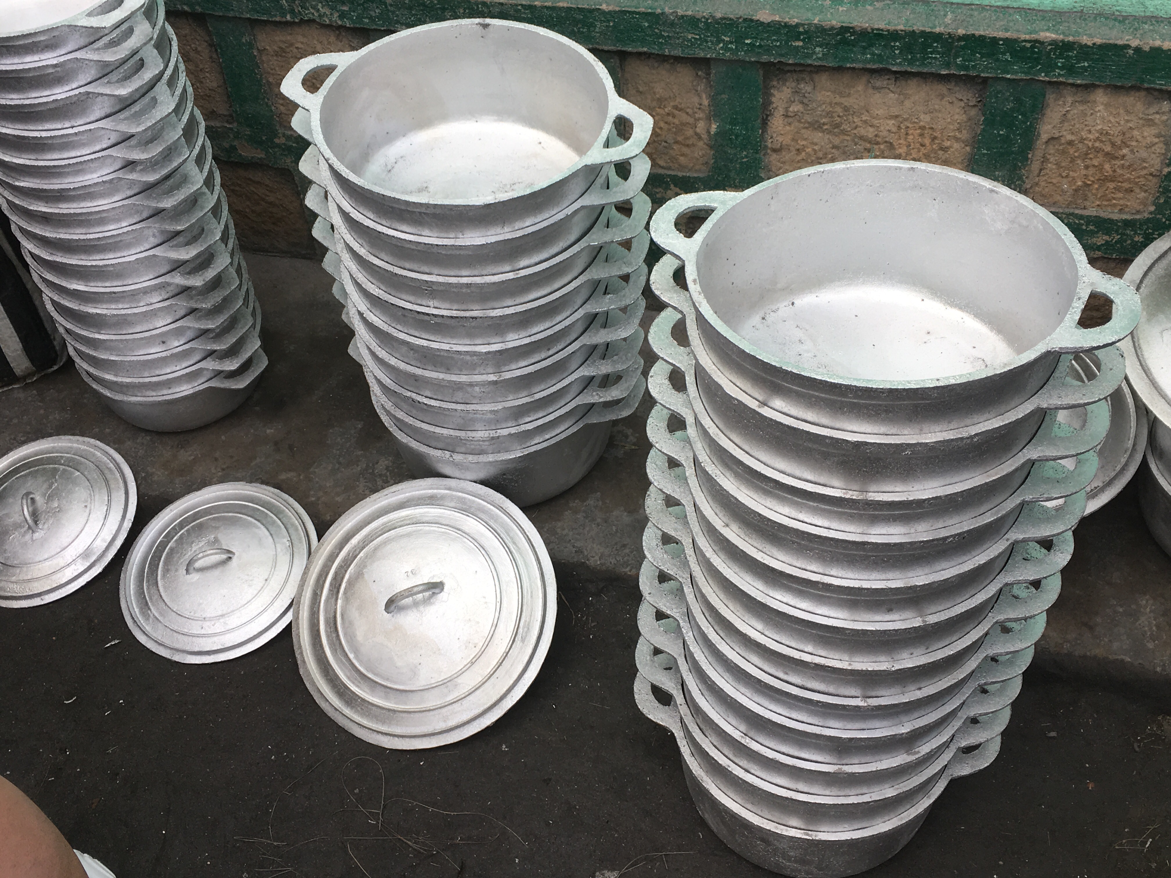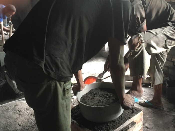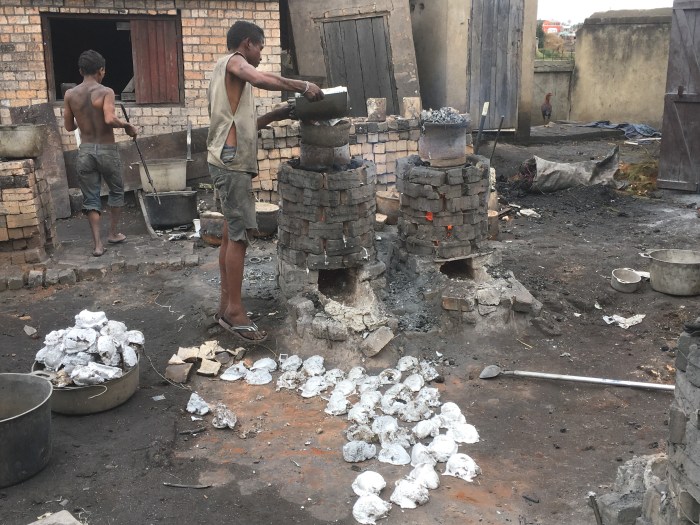 Continuing the long drive day, we stopped at an aluminum pot making factory. It was incredibly simple but dangerous process. The aluminum pots or sold mainly in Madagascar, but other pieces of aluminum products made in other factories are exported. But all of the products are made from recycled aluminum. Bags and bags of old car parts and motor parts and cans and recycled old bits of aluminum window frame or door frame, all that sort of stuff is taken and melted in these outside stoves. The molten aluminum is taken a few feet over to where sand and wood forms receive the molten aluminum. We watched the entire process from start to finish and it was pretty amazing, but clearly OSHA has no presence here.