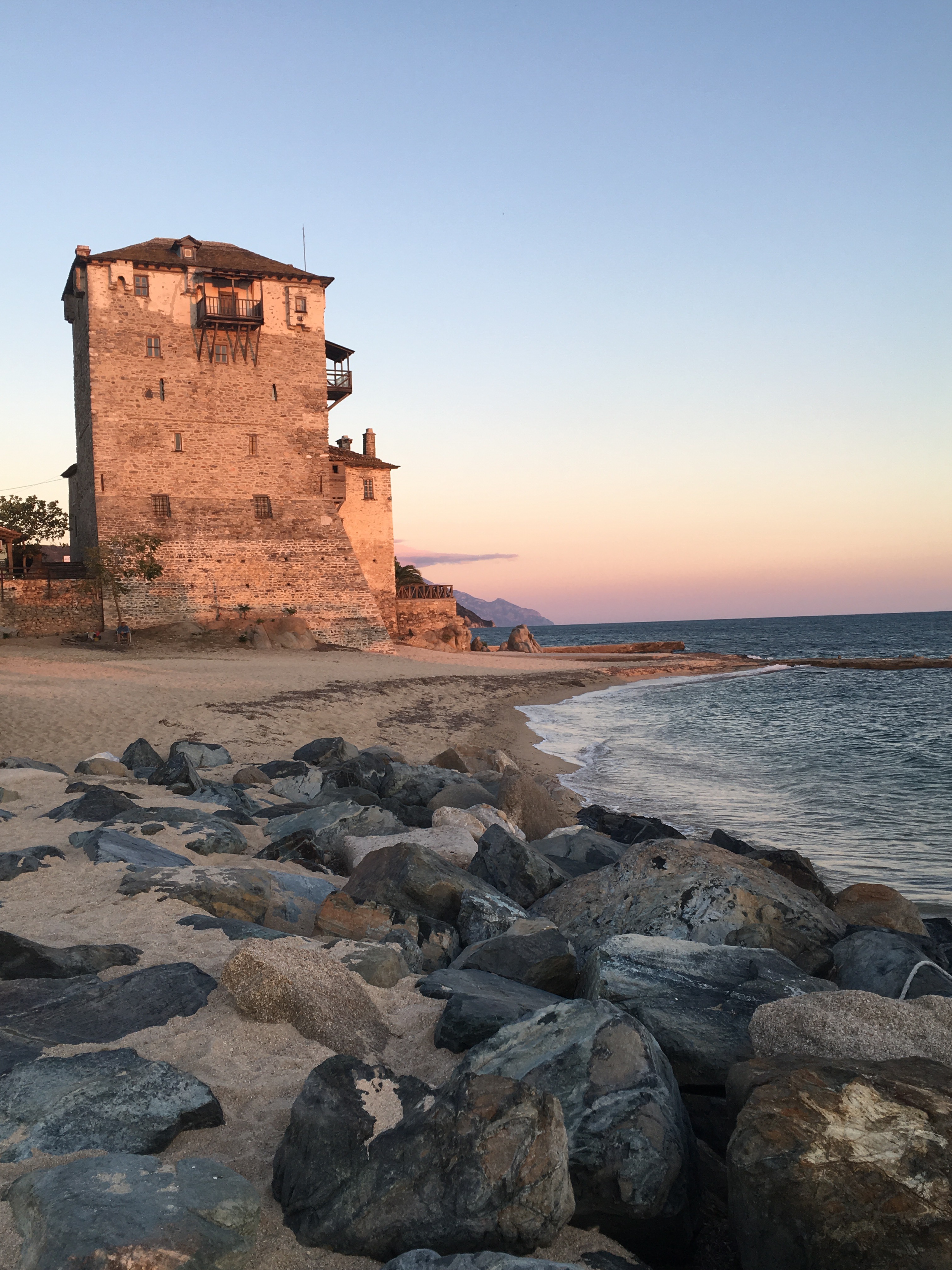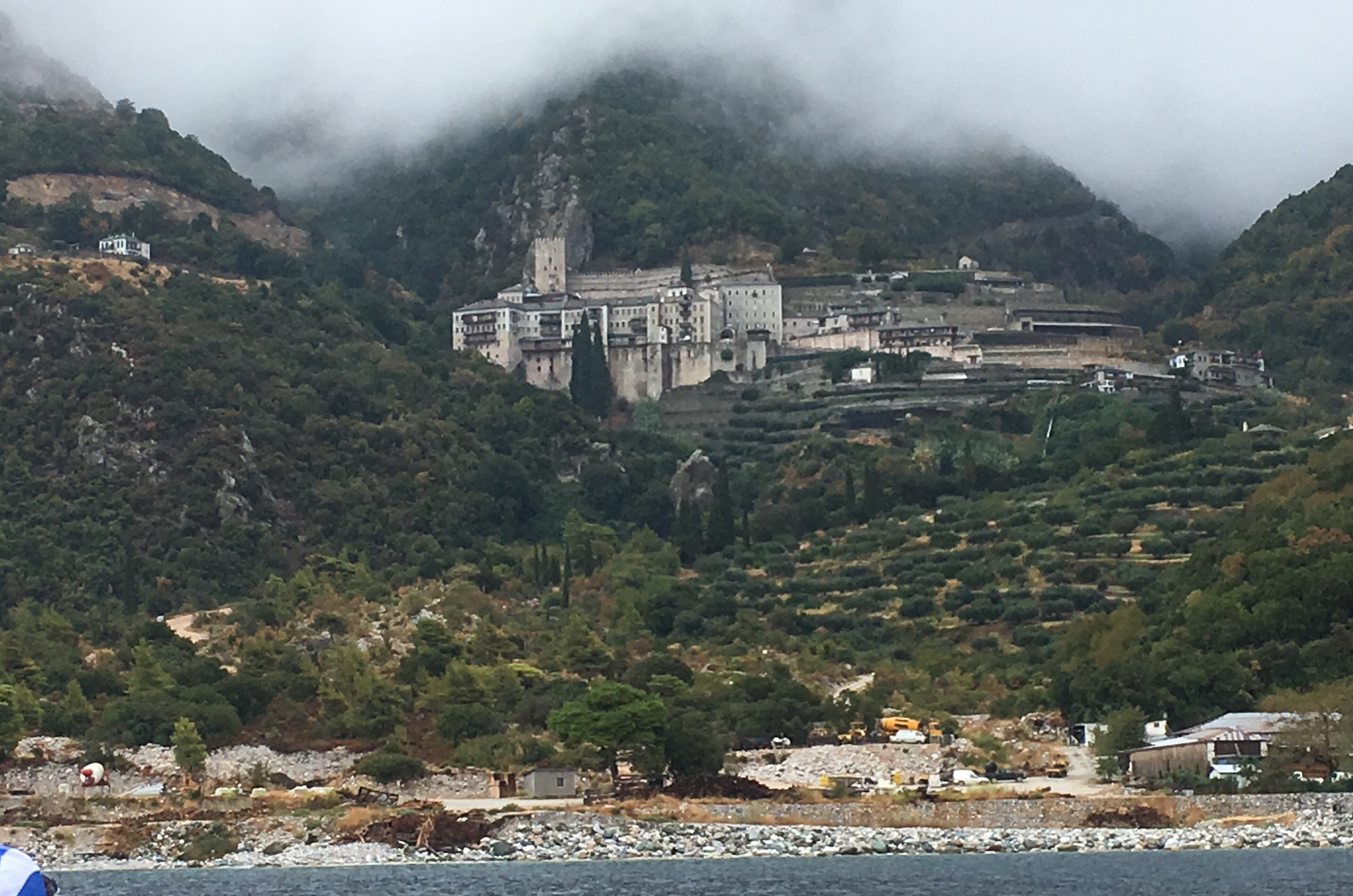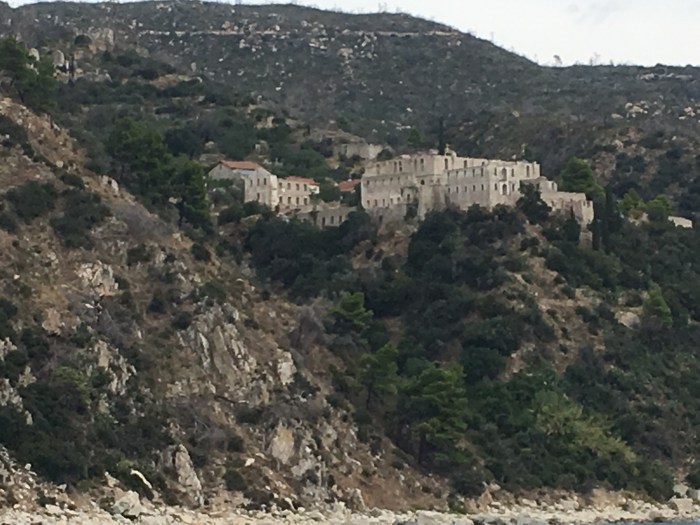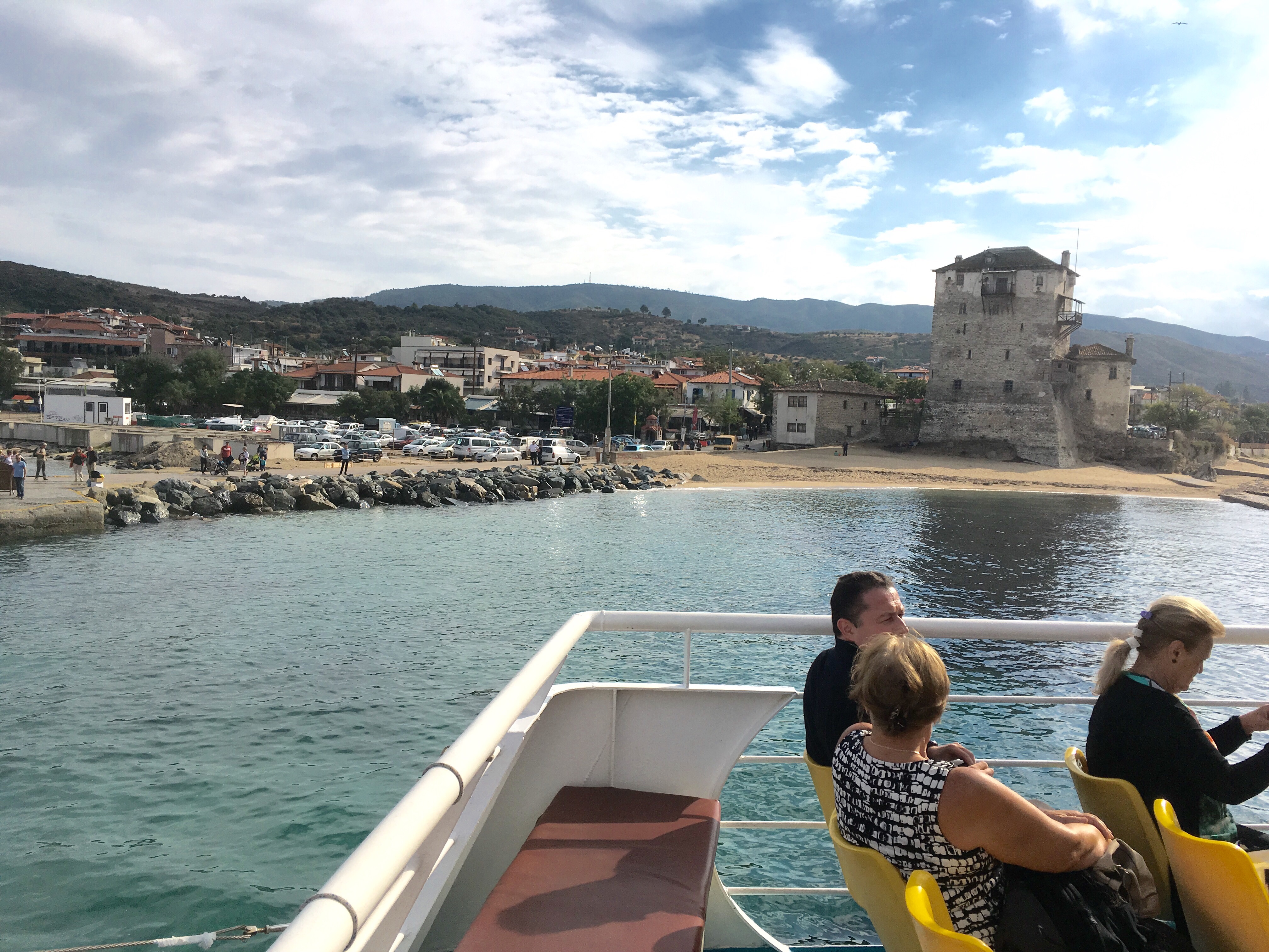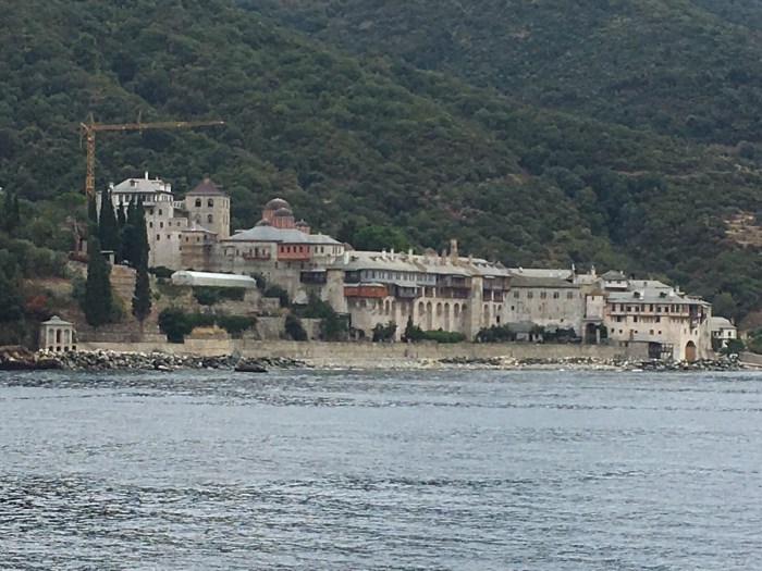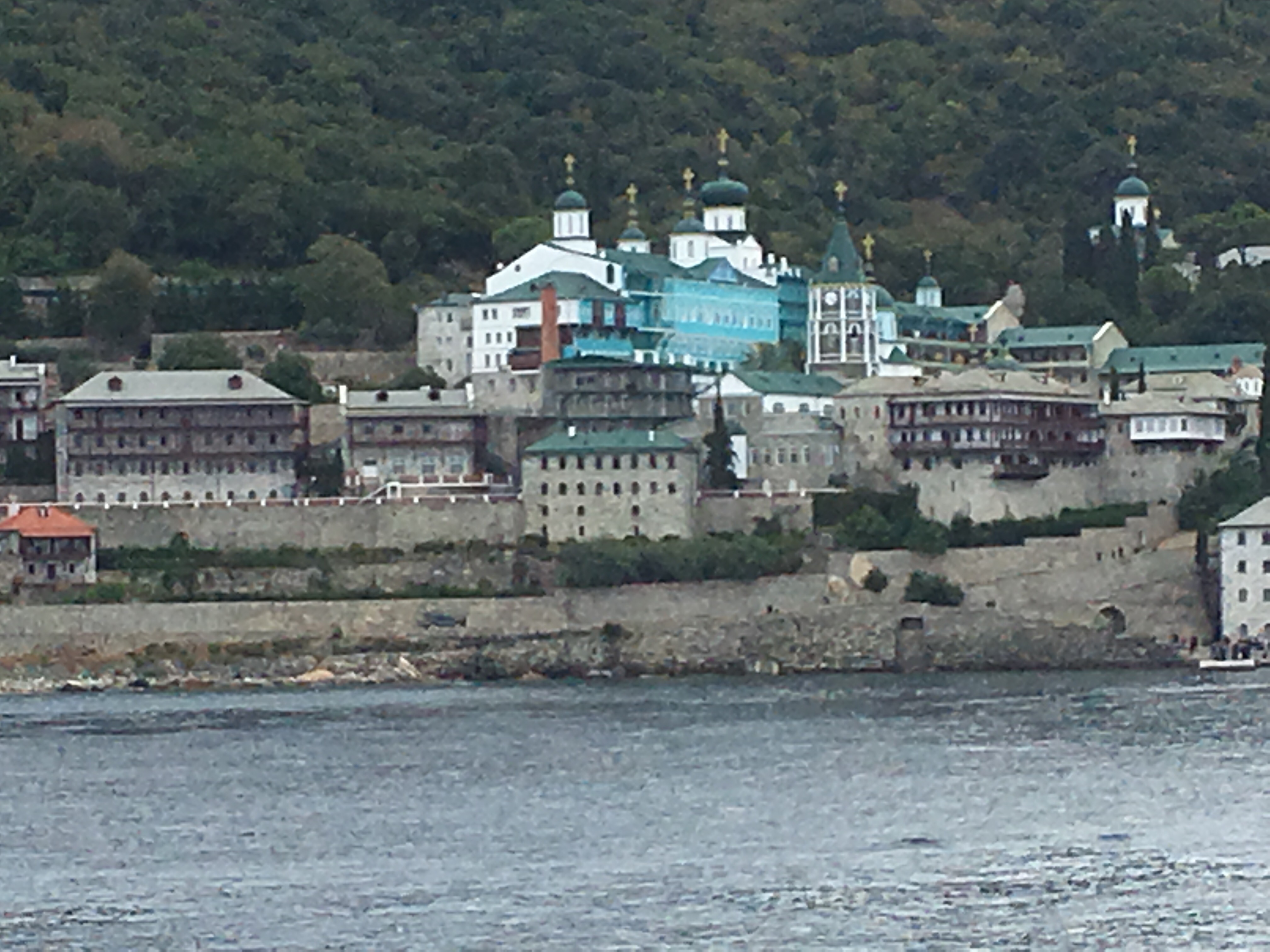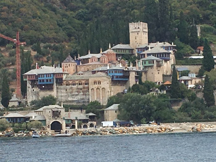In the am, we walked down to das boot for our ride to see the Autonomous Monastic State of the Holy Mountain. It is near Mt Athos. Women are only allowed to see the monestaties from a boat. Men can visit only by permit. Wiki covers it well at https://en.m.wikipedia.org/wiki/Mount_Athos for more. There is an actual wall to keep people out. Hmmm…
