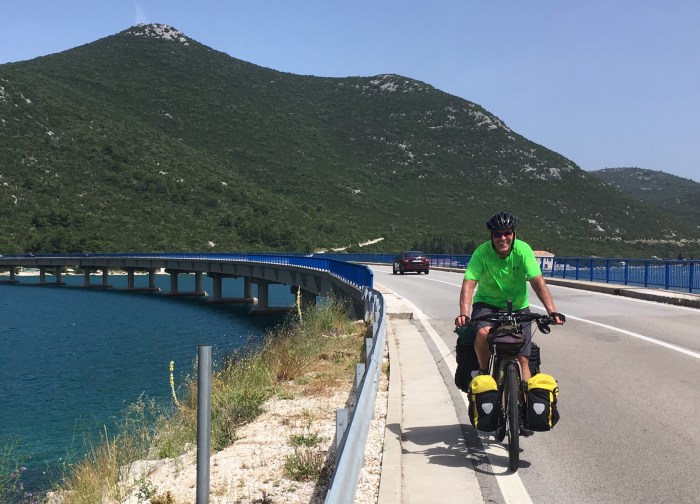Slept well, on the bike at 7 AM to try and beat some of the heat. Great start to the morning although had to push the bike up a very steep hill past an old cemetery, came across the other side and saw the entire Neretva River delta.