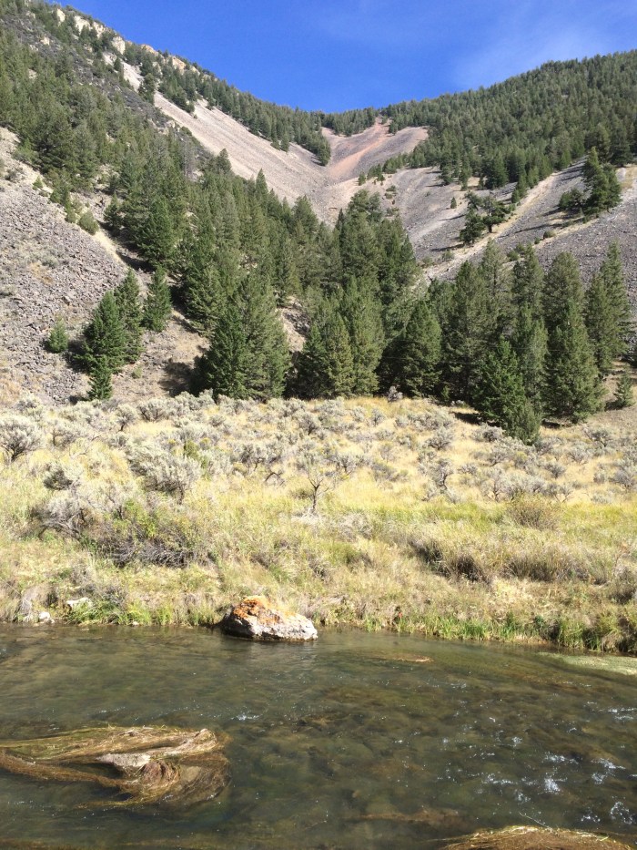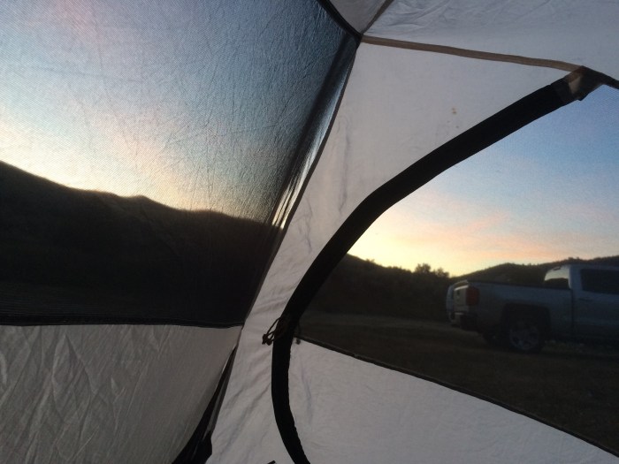 Awoke to the sounds of waterfowl and birds gliding past my tent down to the lake. Another clear sky morning. Sure glad I got a new sleeping bag, though! Probably around 30′, not as cold as Bannack, thankfully.