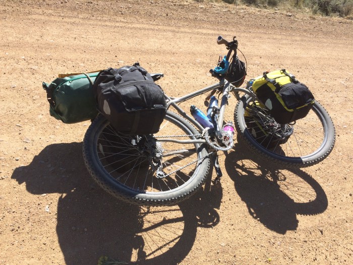 All was good until about 25 miles in and I lost pressure in my poor overloaded rear tire. Took me like two hours to finally figure out I had a puncture vs a lost bead seal from the rough road. Grrr… Anyway, put my only tube in and continued to Mack’s Inn motel to figure out what’ll be the solution ahead. I ended up calling Corey at 7 Corners (the shop that built my bike) to discuss the issue and determined that I will try to limp along with this tire and tube, and he’ll send a new tire to Pinedale where I’ll take a day off. Hopefully the tire arrives as planned and I can install it tubeless style without issue…