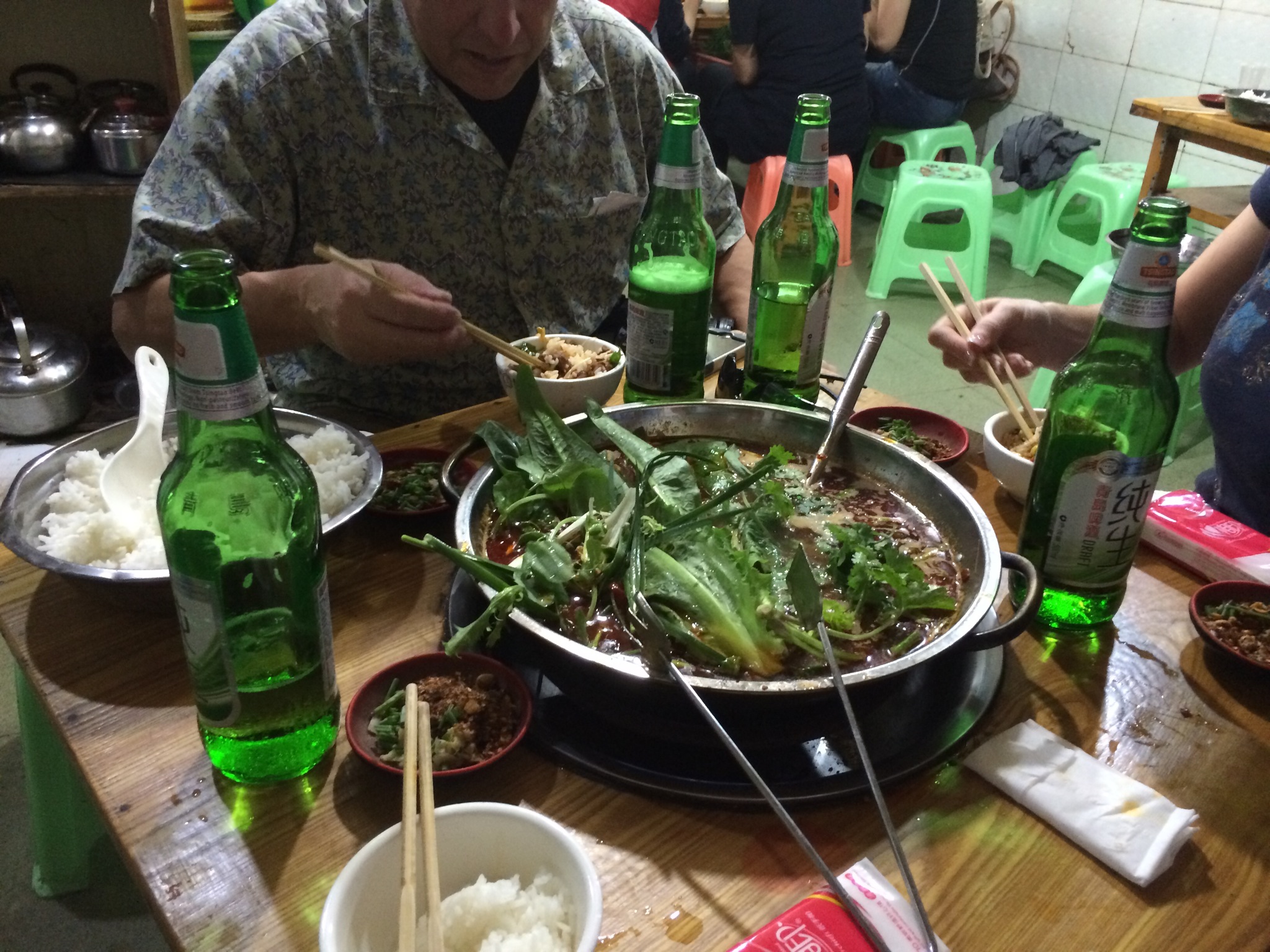 This place was set up with propane burners under large wok type pots in the center of the wooden table. They eventually brought out a bowl of very red soup that had many bits of beef, spices, onions, chopped ginger, garlic, and many many other unidentified contents. The objective was you walked over to the shelf on one side of this place, picked out the greens you wanted to add from at least 30 different fresh and hand picked greens, and add them to the soup, cook the greens a bit in the hot soup, then scoop some out and put it over your bowl of steamed rice that was also served. Lots of dried chilies on the table to spice things up.